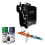 Iwata Airbrush with Smart Jet Pro Compressor kit : Airbrushing allows for more precise control of drying times, paint coverage, gradients, colour blending and they are extremely efficient with paint due to atomization.